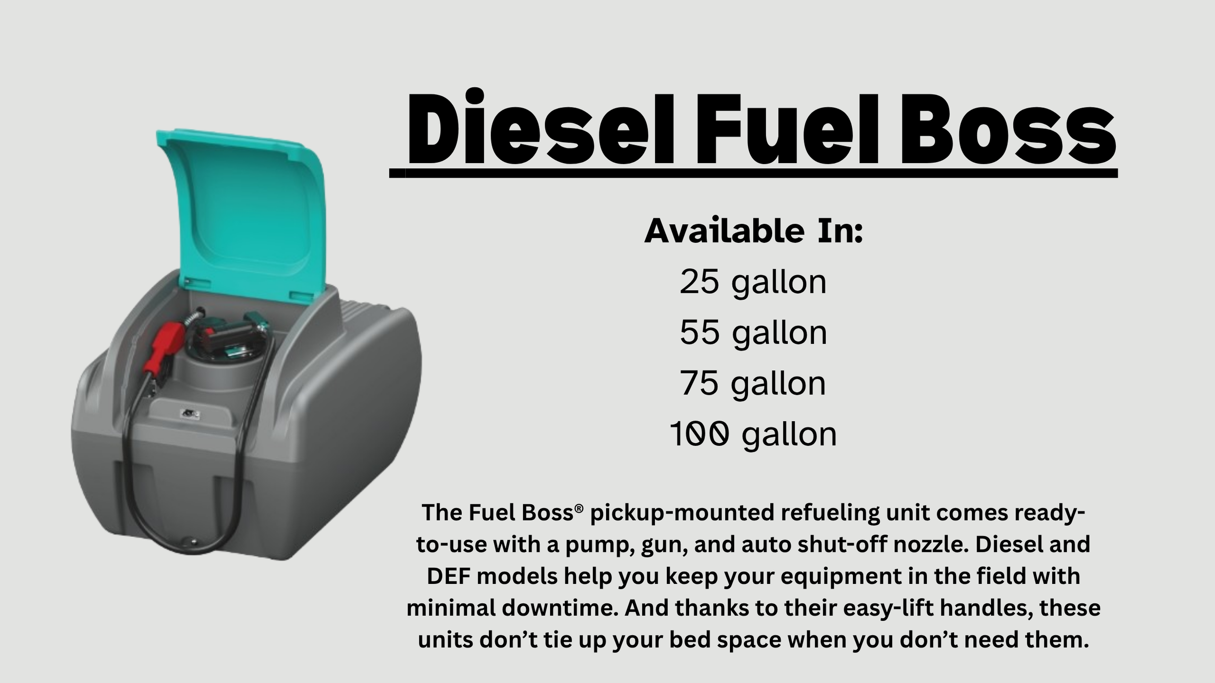 The Diesel Fuel Boss units are your all-in-one unit. Each tank arrives assembled and ready to use. Equipped with a pump, hose and gun. Perfect for all your farm needs.